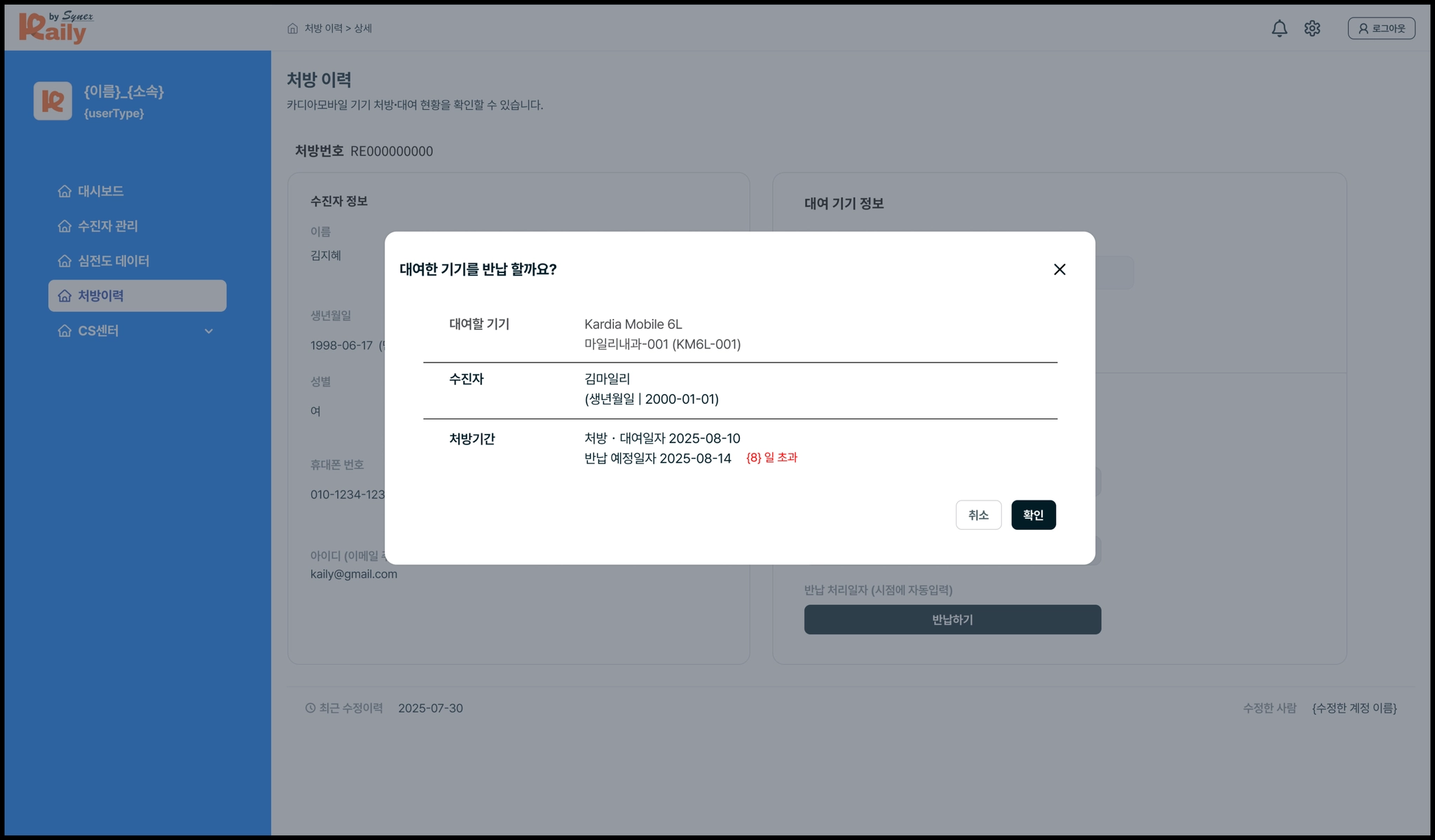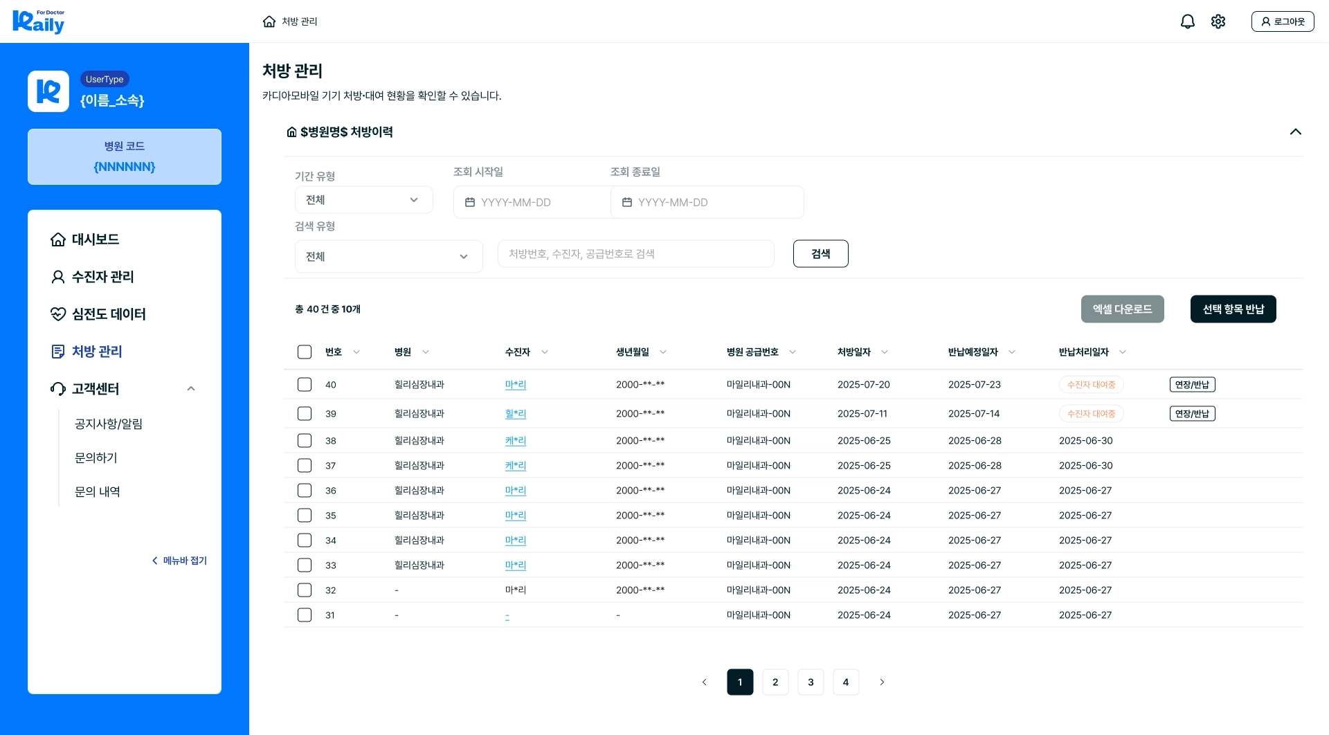 병원에서 카디아모바일 기기를 처방한 내역을 조회・관리할 수 있습니다.