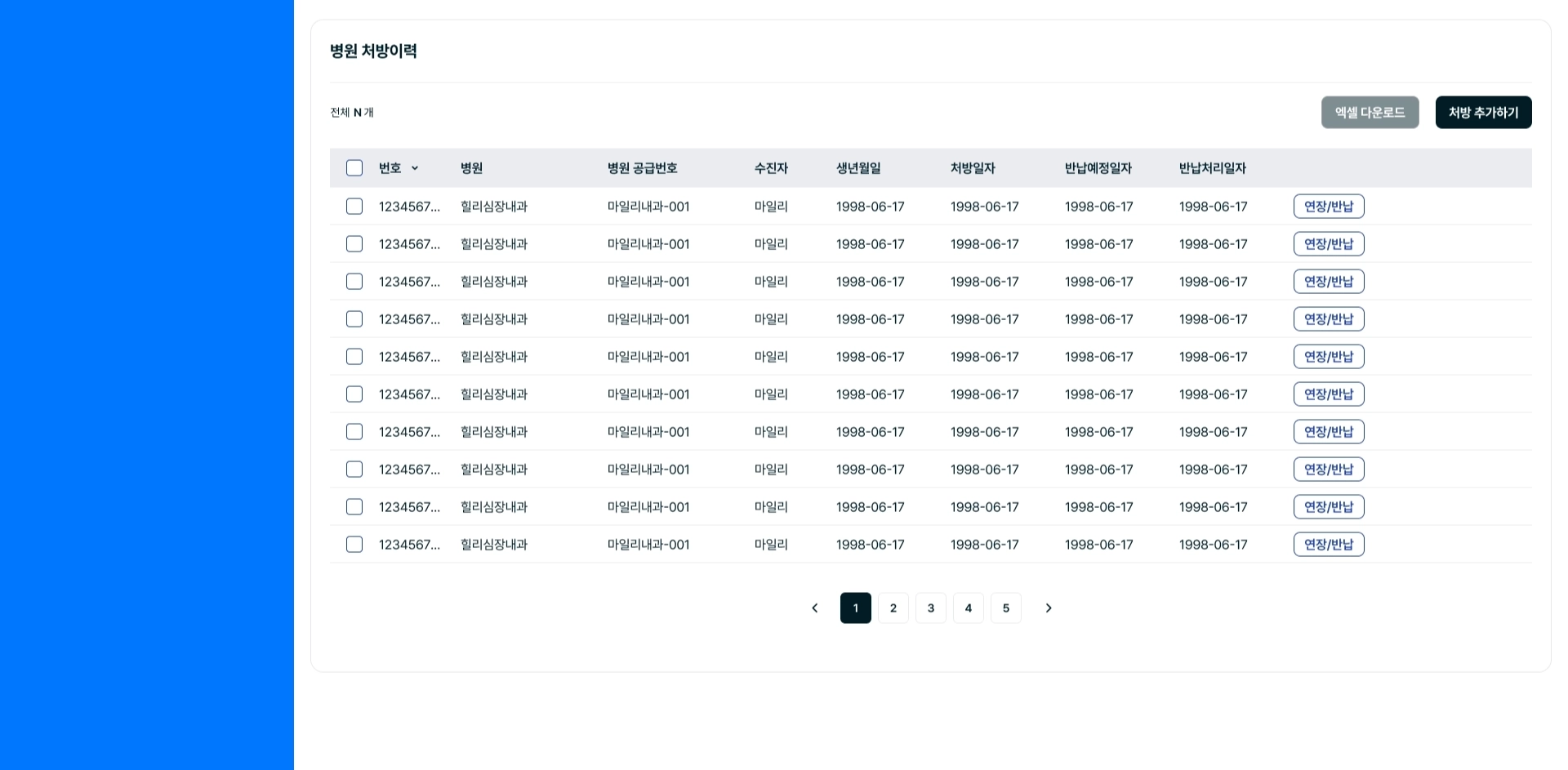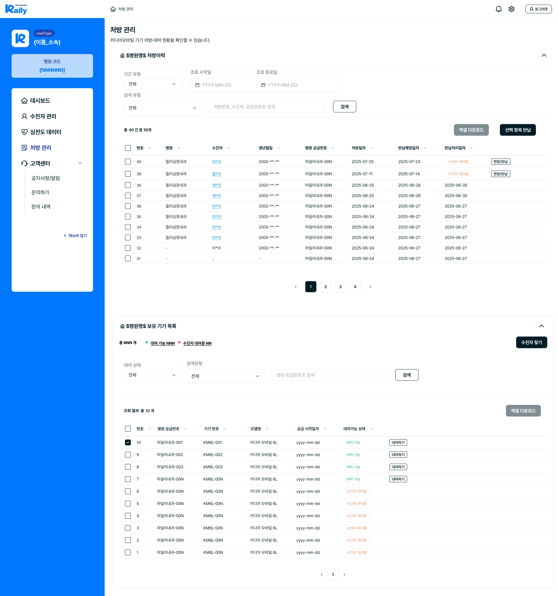 [수진자 관리 - 처방 추가하기]를 통해 생성된 처방(대여)이력이 조회됩니다.