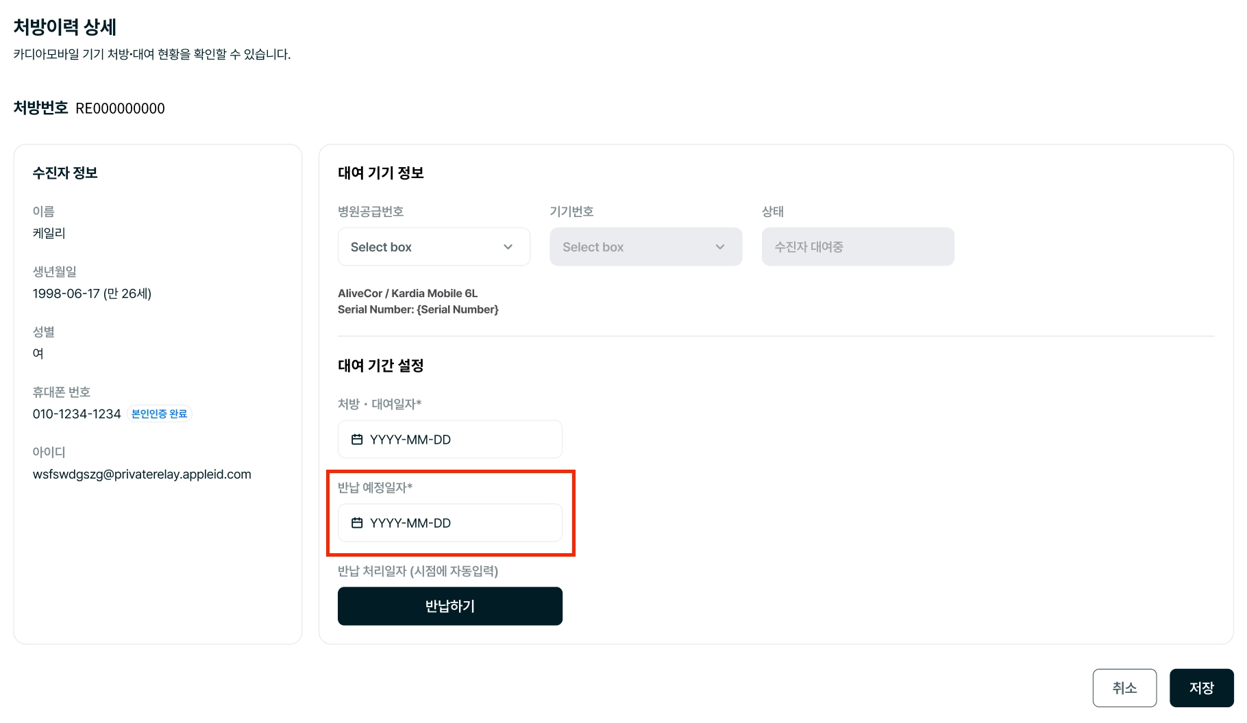 병원의 기기 처방일자를 기준으로 예상 반납일을 선택합니다.