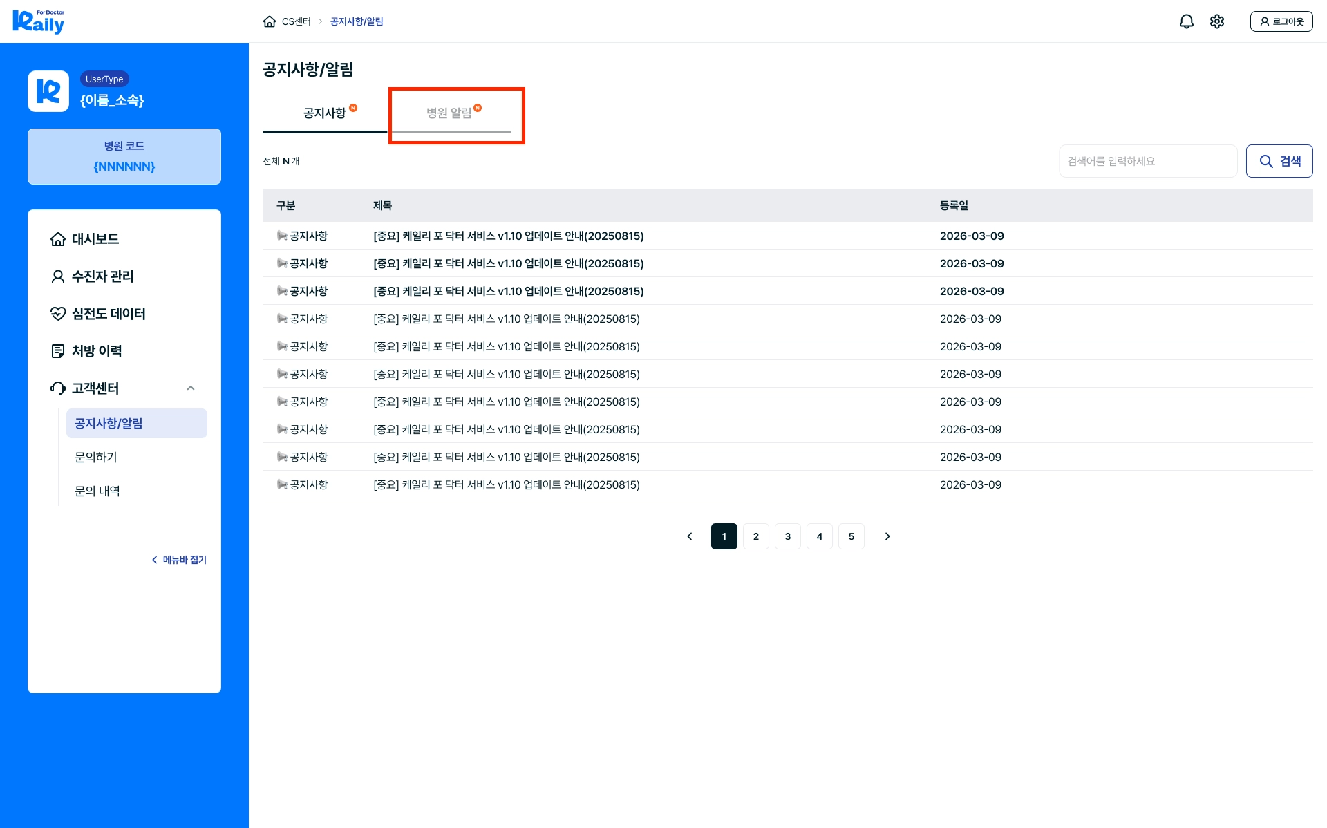 각 병원별로 발송되는 개별 알림은 병원알림 탭에서 확인할 수 있습니다.